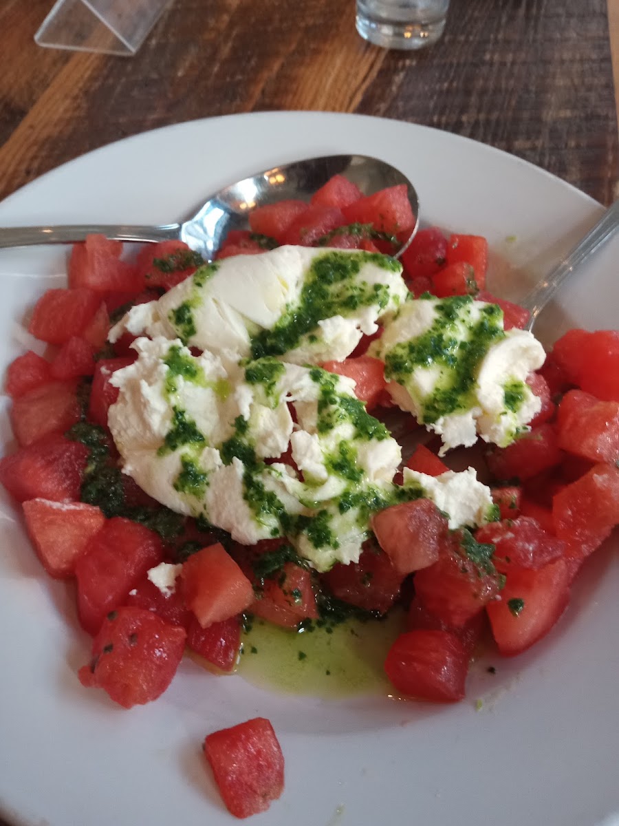 I went there for my Birthday during a non busy time for was me and a hand full of people in the place. Seems like it would be busier in later hours. I ordered the seasonal food items the Meatiash and the watermelon burrata salad. They were both good for the most part the items had different spin on them then normal being a meat lovers pizza and watermelon salad. I wouldn't order either one again but they were good for what they were. If I had a group of people I would probably go back there but by put by myself I would just order a pizza and carry out. Compared to Red light Pizza that I had a while back this is something this is the place you can go to with friends more so than eat a whole of Detroit Pizza by yourself