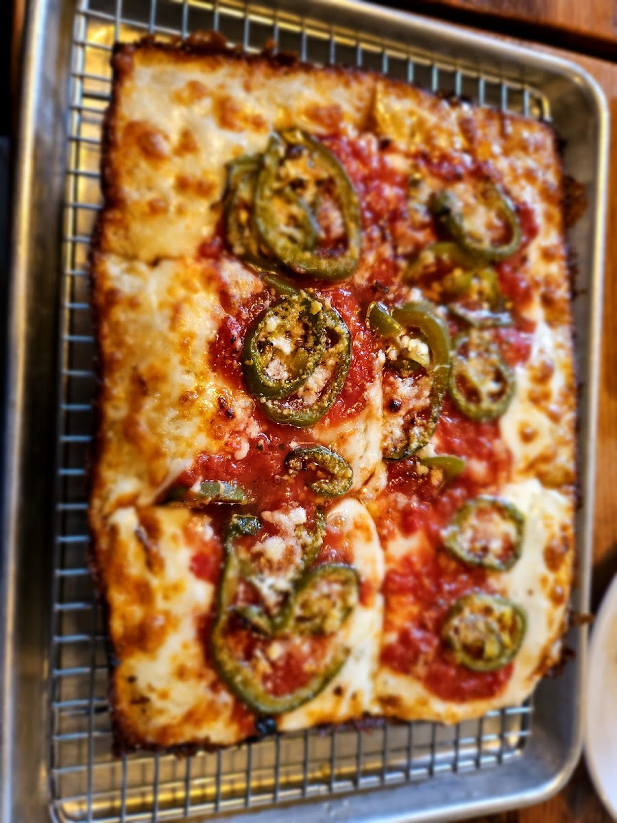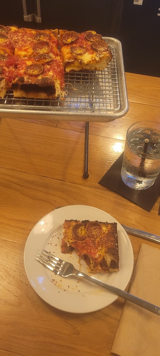 It’s exactly what you’d expect from Emmy squared. Everything is consistent in flavor and texture and comes out as you’re used too. We did a pepperoni and mushroom and their signature honey, pepperoni and Calabrian chili pizzas this time with an order of wings. Always a great choice for delivery or dine in if you want Detroit style pizza in dc. Both locations are great. I get my hair cut near this one so I stop in because it’s quick and easy.